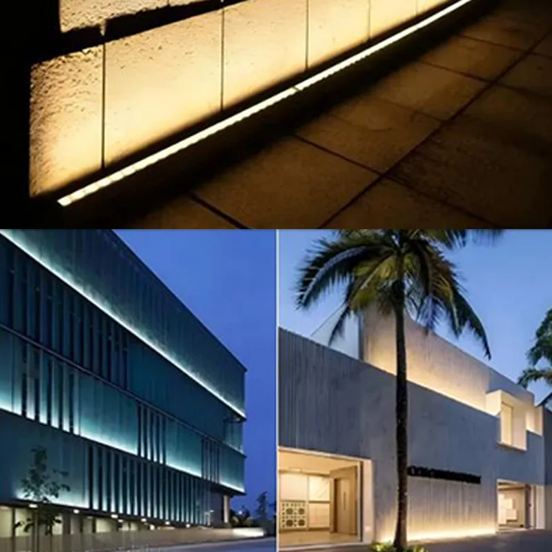 Сәулеттік контурлы жарықтандыру заманауи сызықтарды бөлектейтін құрылыс қасбеттерін біркелкі жарықтандырады.